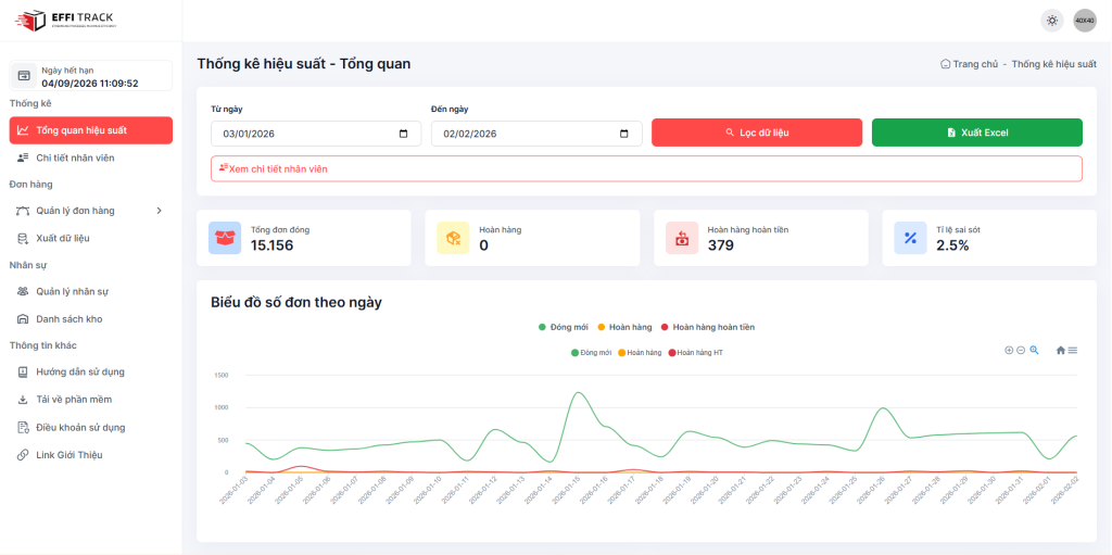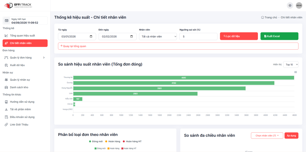Bên cạnh thống kê tổng quan, Ecomtrack còn cung cấp Dashboard chi tiết hiệu suất nhân viên, hỗ trợ quản lý kho theo hướng minh bạch và đo lường rõ ràng: