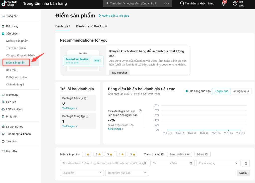 Bước 1: Truy cập vào trang Điểm sản phẩm trong Trung tâm nhà bán hàng.