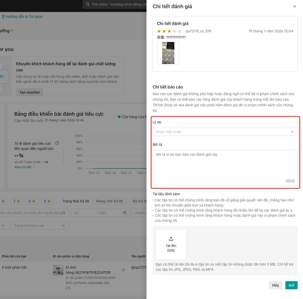 Lưu ý: Việc gửi báo cáo không đồng nghĩa với việc đánh giá sẽ được xóa. Báo cáo của bạn chỉ được tiếp nhận để TikTok Shop xem xét và quyết định cuối cùng thuộc về nền tảng dựa trên chính sách hiện hành.